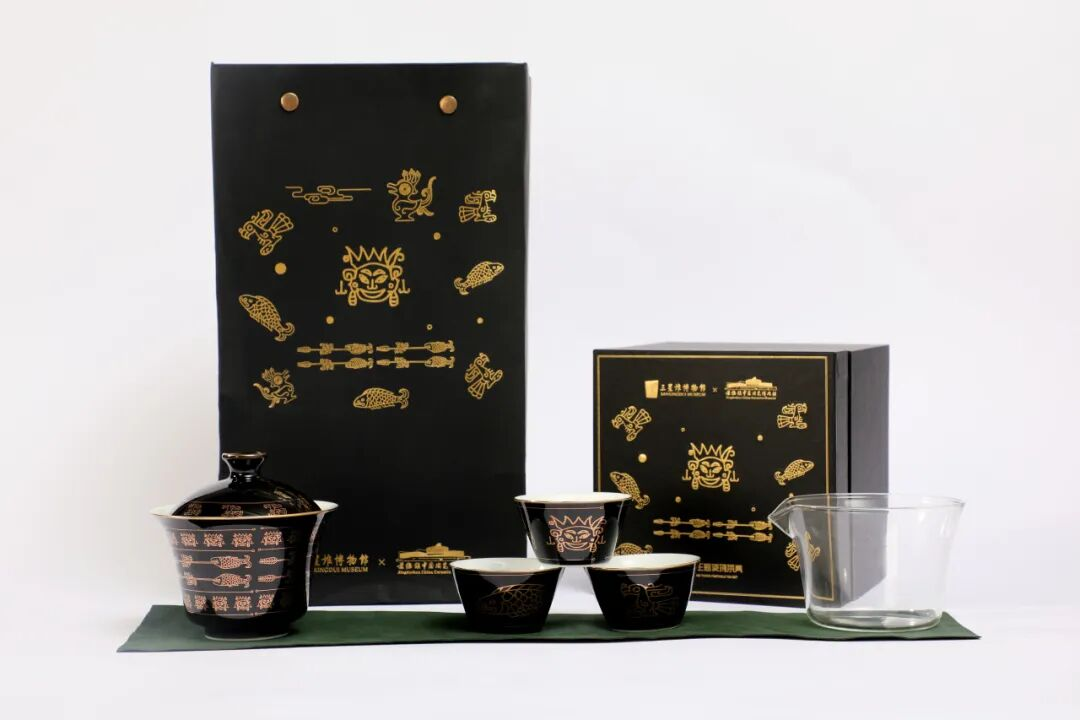 景德镇中国陶瓷博物馆携手三星堆博物馆联名出品的4款文创产品(三星堆金杖茶具、三星堆金杖旅行茶具、神氣香具组合、三星堆神鸟香薰)也在开馆当日同步推出。