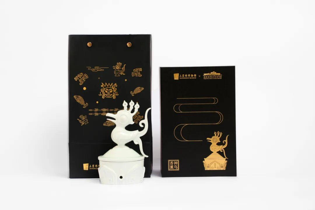它们画面取自三星堆出土文物金杖与青铜神鸟元素,以景德镇传统高温颜色釉、陶瓷雕塑、釉上金彩等多项工艺,历经4个多月的元素发掘、沟通设计、打样生产等流程终于与观众见面。